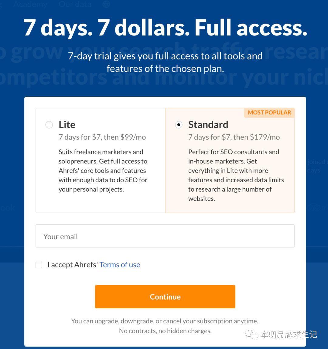 比如:Ahref這種低價限時付費試用,看似是全功能的,個人版其實就是部分核心功能的受限制組合,面向的是自由職業(yè)者和個人事業(yè)主,標準版面向的是企業(yè)。