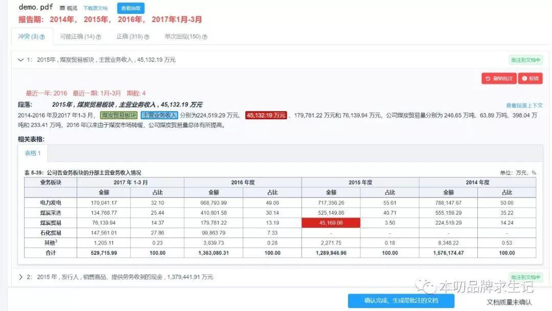 用戶只需上傳一個Word格式的 “債券募集說明書”,過大約半個小時,這一功能就能自動找到募集說明書里財務(wù)數(shù)據(jù)可能的錯誤和沖突,一條一條的列出來供用戶復(fù)核。