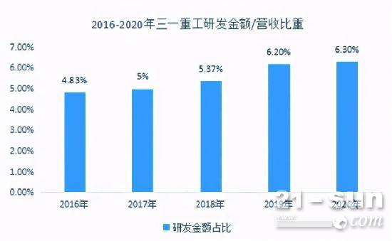 根據財報顯示,公司2020年研發費用為62.59億元,同比增長33.2%,占營業收入的比重為6.3%。截至2020年底,公司研發人員達5346人,同比增長69%。與此同時,三一重工全面開展數字化設計和數字化仿真技術研究,研發質量與效率大幅提升,研發周期降低20%以上。截至2020年底,公司累計申請專利10278項,授權專利7613項,申請及授權專利均位居國內行業第一。