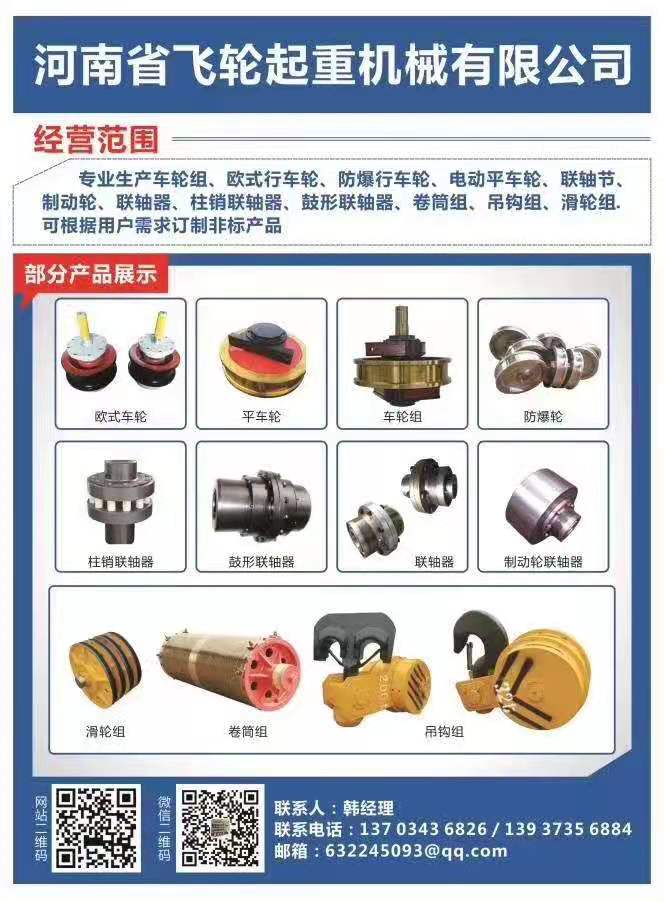 聯系熱線:河南省飛輪起重機械有限公司,專業生產車輪組|歐式車輪組|防爆行車輪|電動平車輪|聯軸接|制動輪聯軸器|柱銷聯軸器|鼓型聯軸器|卷筒組|吊鉤組|滑輪組等雙梁起重產品,可根據用戶需求定制雙梁起重配件。 選擇飛輪起重是正確的選擇,我們期待與您達成合作!